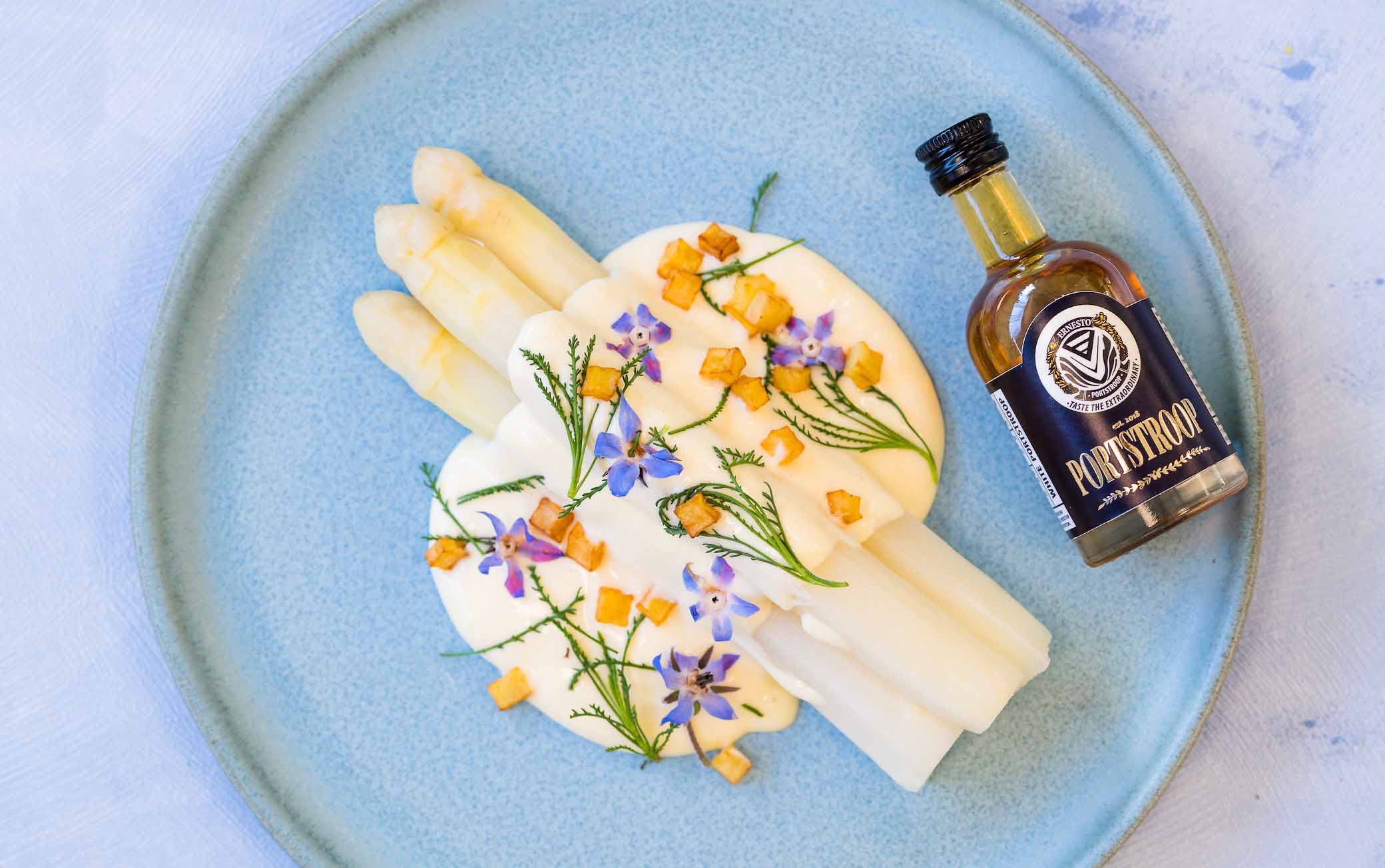 - Haal de courgette bloemen uit de oven, presenteer ze op een mooi bord en schenk als afwerking nog beetje witte portstroop over.