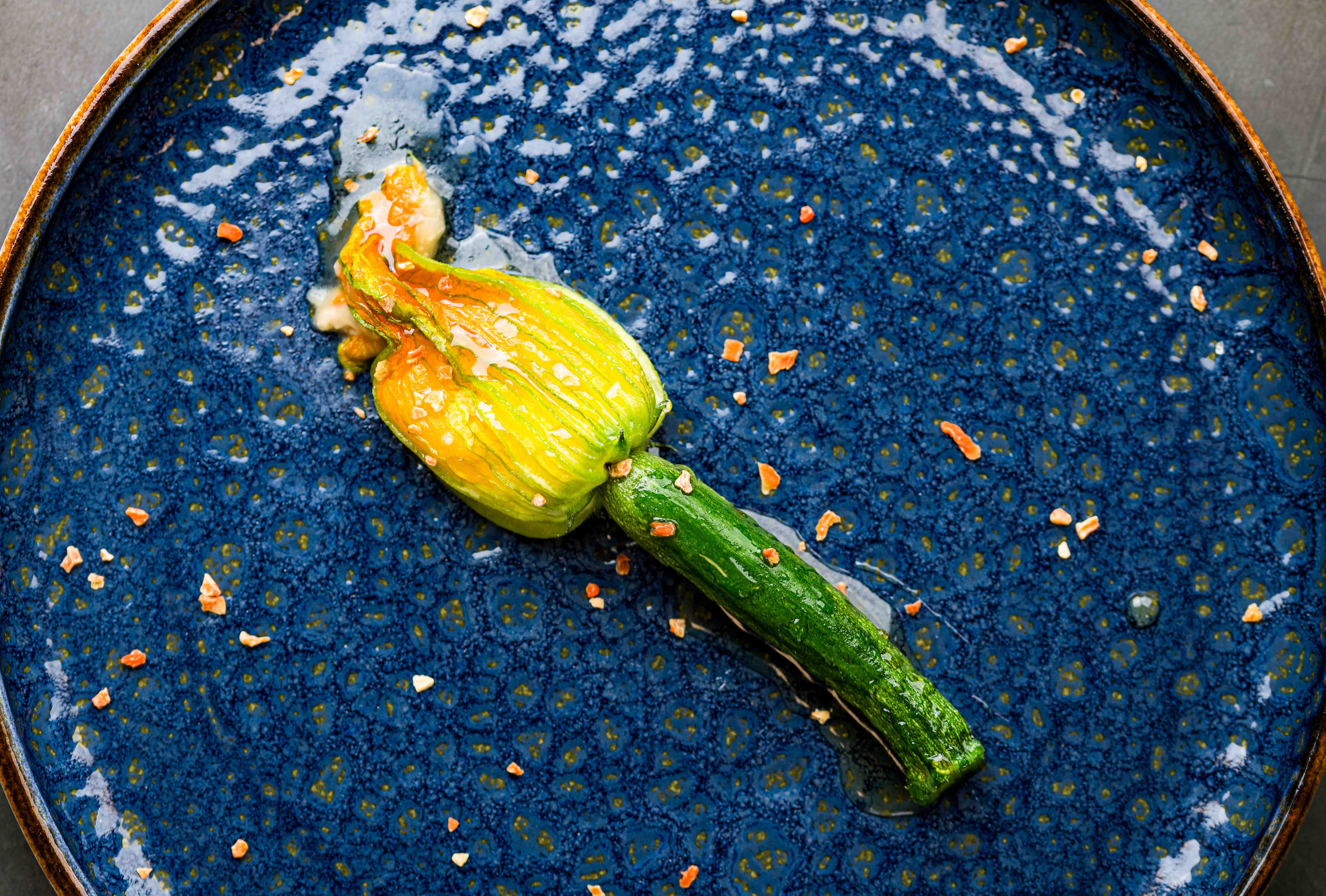 - Haal de courgette bloemen uit de oven, presenteer ze op een mooi bord en schenk als afwerking nog beetje witte portstroop over.